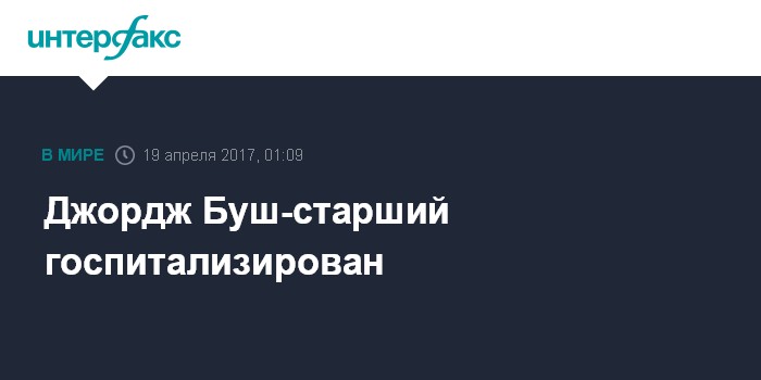 Москва. 19 апреля. INTERFAX.RU - 41-й президент Соединенных Штатов Америки Джордж Буш-старший госпитализирован во вторник, передает телеканал NBC News со ссылкой на пресс-секретаря Джима Макграта.