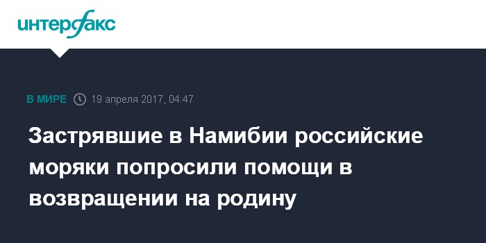 Москва. 19 апреля. INTERFAX.RU - Российские члены экипажа перуанского траулера "Шериф", застрявшие в Намибии, просят помочь им вернуться на родину, за содействием они обратились в Международную федерацию транспортников (МФТ).