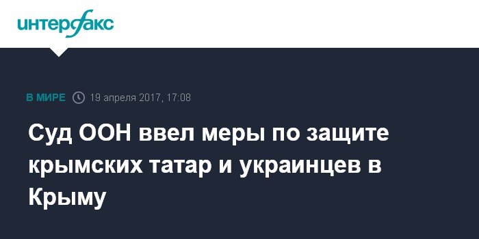 Москва. 19 апреля. INTERFAX.RU - Международный суд ООН (Гаага) принял решение о введении мер для защиты и обеспечения прав украинцев и крымских татар на территории Крыма в рамках соблюдения Конвенции о ликвидации всех форм расовой дискриминации, однако эти меры будут не аналогичны тем, которые запрашивала Украина.