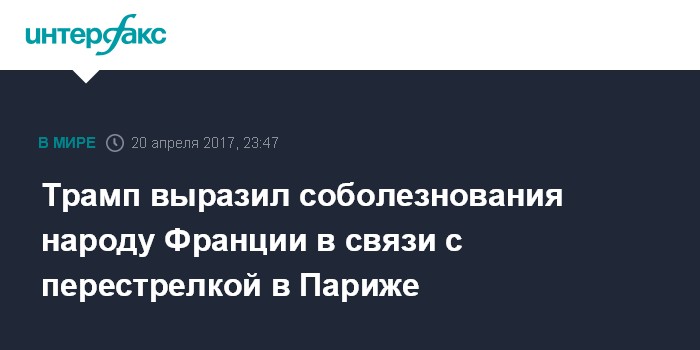 Москва. 20 апреля. INTERFAX.RU - Президент США Дональд Трамп выразил соболезнования народу Франции в связи с перестрелкой в Париже.