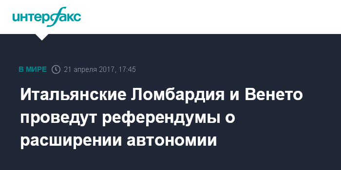 Москва. 21 апреля. INTERFAX.RU - Представитель итальянской оппозиционной партии "Лига Севера" Паоло Гримолди в пятницу объявил о проведении 22 октября консультативных референдумов о большей автономии от центральных властей в двух областях Италии - Ломбардии и Венето.