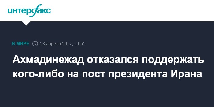 Москва. 23 апреля. INTERFAX.RU - Не попавший в число кандидатов на выборах главы Ирана бывший президент страны Махмуд Ахмадинежад заявил в воскресенье, что не планирует поддерживать никого из политиков, претендующих на этот пост.