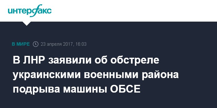Москва. 23 апреля. INTERFAX.RU - Украинские военные обстреливают район подрыва автомобиля патруля Специальной мониторинговой миссии (СММ) ОБСЕ в окрестностях села Пришиб Славяносербского района, заявил полномочный представитель самопровозглашенной Луганской народной республики на минских переговорах Владислав Дейнего.