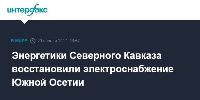 Москва. 23 апреля. INTERFAX.RU - Нарушенное днем сильным порывистым ветром электроснабжение жителей Южной Осетии восстановлено, сообщает департамент по связям с общественностью МРСК Северного Кавказа.