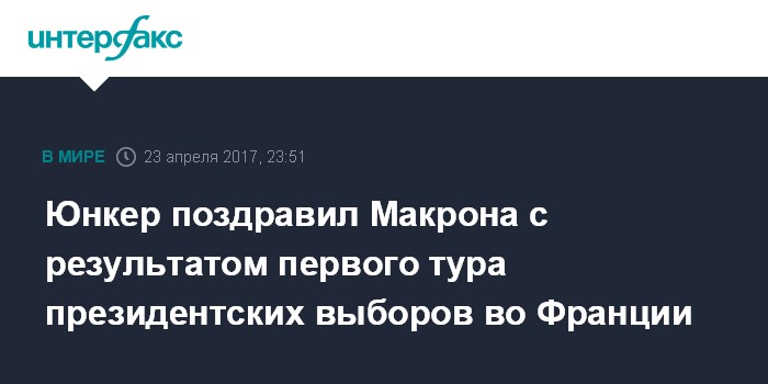 "Председатель Еврокомиссии Жан-Клод Юнкер поздравил Эмманюэля Макрона с его результатом в первом туре и пожелал ему мужества в дальнейшем на президентских выборах 2017 года", - написал Схинас в твиттере.