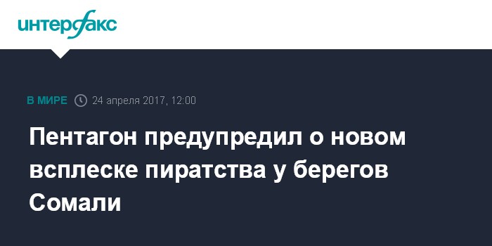 Москва. 24 апреля. INTERFAX.RU - Министерство обороны США сообщило об учащении случаев нападений пиратов у берегов Сомали и предупредило торговые суда о необходимости принимать меры безопасности.
