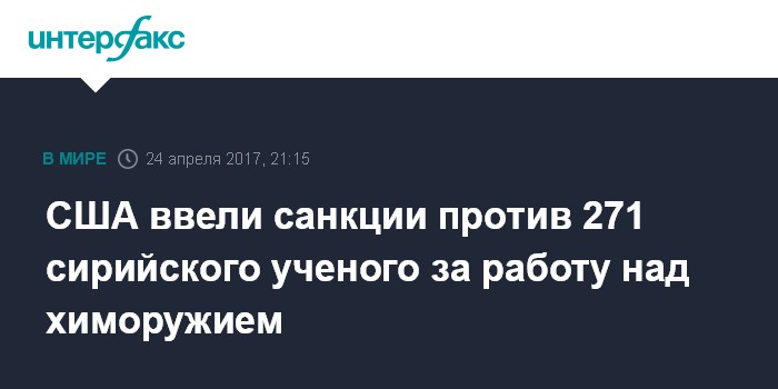 Москва. 24 апреля. INTERFAX.RU - Управление по контролю за иностранными активами Минфина США ввело в понедельник санкции против 271 сотрудника Сирийского научно-исследовательского центра, объявил министр финансов Стивен Мнучин.