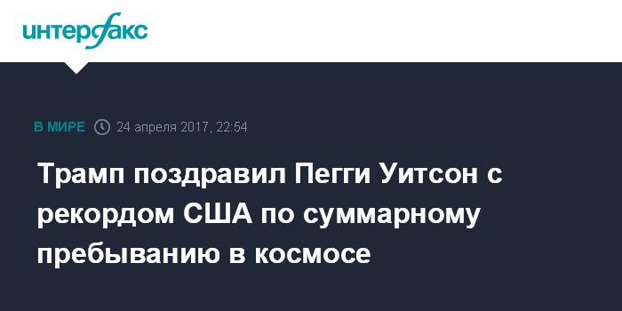 Москва. 24 апреля. INTERFAX.RU - Президент США Дональд Трамп в понедельник поздравил Пеги Уитсон с тем, что она установила рекорд продолжительности суммарного пребывания в космосе среди американских астронавтов, сообщается в понедельник на сайте NASA.