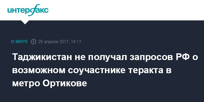 Москва. 25 апреля. INTERFAX.RU - В Генпрокуратуре Таджикистана пока не получали официальных запросов от российских коллег по поводу фигуранта дела о теракте в петербургском метро Содика Ортикова.