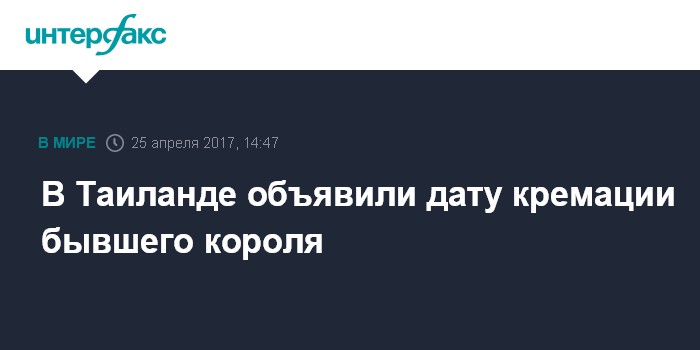 Москва. 25 апреля. INTERFAX.RU - Церемония кремации бывшего короля Таиланда Пумипона Адульядета, скончавшегося в октябре прошлого года, пройдет 26 октября этого года, объявили во вторник таиландские СМИ со ссылкой на военное руководство страны.
