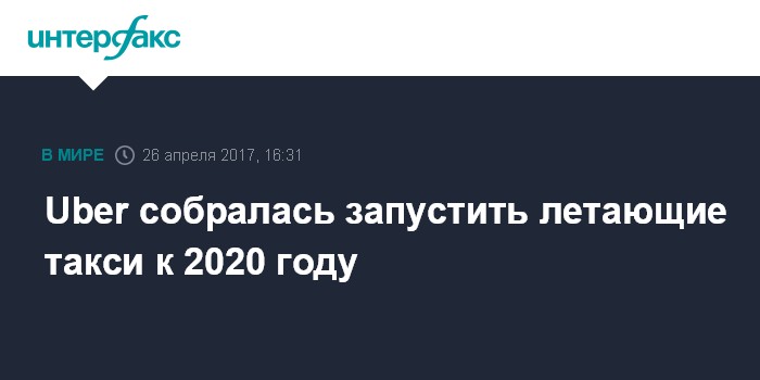 Москва. 26 апреля. INTERFAX.RU - Американская Uber Technologies Inc., разработчик сервиса по заказу такси, планирует запустить летающие автомобили с пилотом к 2020 году, сообщил главный исполнительный директор компании Джефф Холден.