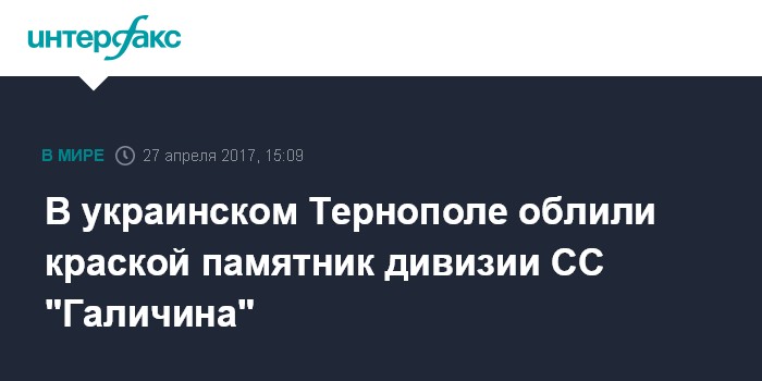 Москва. 27 апреля. INTERFAX.RU - В Тернополе неизвестные облили красной краской памятный знак в честь дивизии СС "Галичина" в преддверии 28 апреля - 74-й годовщины создания дивизии, сообщает городской совет.