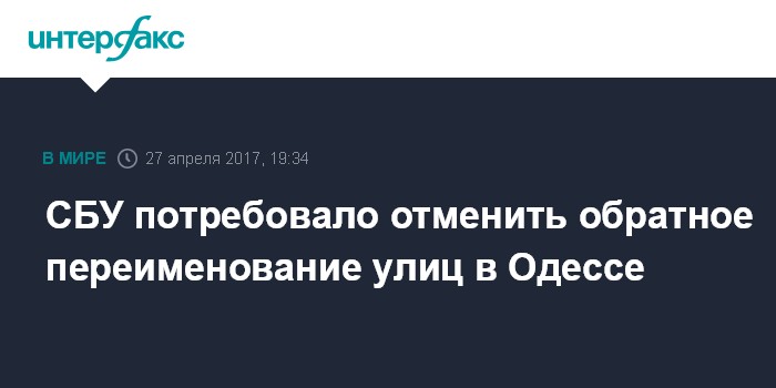 Москва. 27 апреля. INTERFAX.RU - Начальник Управления Службы безопасности Украины в Одесской области Сергей Батраков официально потребовал от мэра Одессы Геннадия Труханова отменить решение горсовета, которым ряду улиц и переулков возвращались названия, присвоенные во времена Советского Союза.