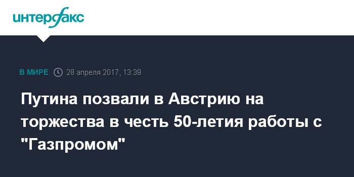 Москва. 28 апреля. INTERFAX.RU - Председатель правления австрийского нефтегазового концерна OMV Райнер Зеле пригласил Владимира Путина приехать в Австрию на торжества, посвященные 50-летию сотрудничества его компании с "Газпромом".