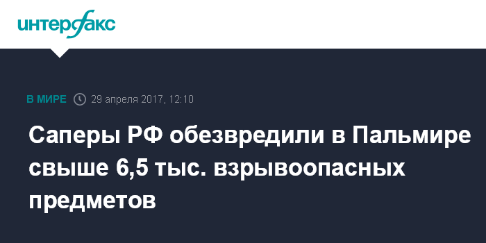 Москва. 29 апреля. INTERFAX.RU - Российские саперы обезвредили в исторической части Пальмире более 6600 взрывоопасных предметов, очистив более 1,5 тыс. га территории, сообщили "Интерфаксу" в департаменте информации Минобороны РФ.