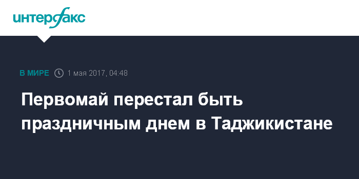 Москва. 1 мая. INTERFAX.RU - Рабочим днем будет в этом году Первомай в Таджикистане. Парламент Таджикистана 16 ноября прошлого года одобрил предложенные правительством страны поправки в закон "О праздничных днях", согласно которым 1 мая продолжает оставаться в списке праздничных, но не является нерабочим днем, предложение тогда было принято депутатами без обсуждений.