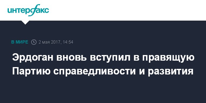 Москва. 2 мая. INTERFAX.RU - Президент Турции Реджеп Тайип Эрдоган вновь вступил в ряды правящей Партии справедливости и развитии (ПСР), сообщает во вторник газета The Hurriyet.