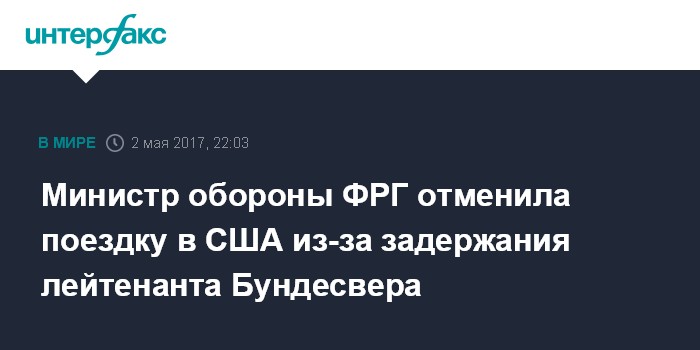 Москва. 2 мая. INTERFAX.RU - Глава Минобороны ФРГ Урсула фон дер Ляйен отменила визит в США в связи со скандалом вокруг задержанного военнослужащего, который подозревается в подготовке атак, сообщают во вторник немецкие СМИ.