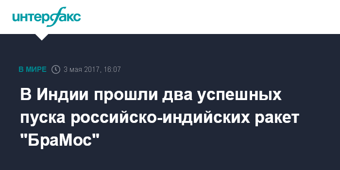 Москва. 3 мая. INTERFAX.RU - Сухопутные войска Индии во вторник и в среду выполнили два успешных пуска российско-индийских сверхзвуковых крылатых ракет "БраМос", сообщает Минобороны Индии.