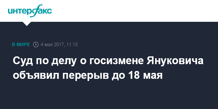 Москва. 4 мая. INTERFAX.RU - Оболонский районный суд Киева, где ранее в четверг начался процесс по делу о госизмене экс-президента Украины Виктора Януковича, объявил перерыв в заседании до 18 мая.