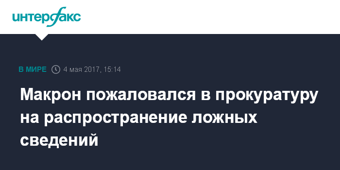 Москва. 4 мая. INTERFAX.RU - Кандидат в президенты Франции от движения "Вперед!" Эммануэль Макрон подал жалобу в прокуратуру, касающуюся распространения о нем ложной информации, сообщает в четверг местная пресса.