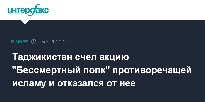 Москва. 5 мая. INTERFAX.RU - В Таджикистане посчитали, что акция "Бессмертный полк" противоречит исламским традициям, и поэтому отказались от ее проведения в этом году. Еще одна причина такого решения - продолжающаяся война в приграничных зонах Таджикистана и Афганистана. Об этом сообщает Национальное информационное агентство Таджикистана "Ховар"