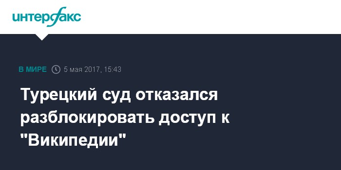 Москва. 5 мая. INTERFAX.RU - Уголовный суд Анкары отклонил запрос фонда "Викимедия", стоящего за информационным порталом Wikipedia, на снятие с него блокировки, запрещающей доступ к сайту на всей территории Турции, сообщило в пятницу агентство Anadolu.