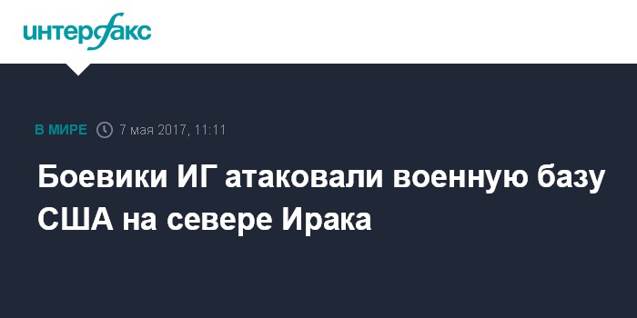 Москва. 7 мая. INTERFAX.RU - Боевики террористической группировки "Исламское государство" (ИГ, запрещена в РФ) напали на военную базу на севере Ирака, где размещаются американские военные советники, сообщают в воскресенье местные СМИ со ссылкой на источники в силах безопасности Ирака.