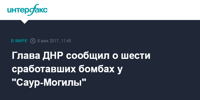 Москва. 8 мая. INTERFAX.RU - Шесть взрывных устройств, начиненных поражающими элементами, были установлены на трассе близ мемориального комплекса "Саур-Могила", заявил журналистам глава самопровозглашенной Донецкой народной республики Александр Захарченко.