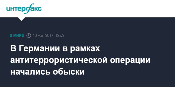 Москва. 10 мая. INTERFAX.RU - Сотрудники генеральной прокуратуры Германии в рамках антитеррористической операции проводят обыски по адресам в четырех федеральных землях, сообщает в среду немецкая газета Bild со ссылкой на представителя ведомства.