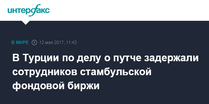 Москва. 12 мая. INTERFAX.RU - Представители турецких властей задержали 57 бывших и нынешних сотрудников фондовой биржи Borsa Istanbul по подозрению в связях с организацией оппозиционного богослова Фетхуллаха Гюлена, которого Анкара обвиняет в организации путча 16 июля 2016 года, сообщает турецкое издание Daily Sabah.