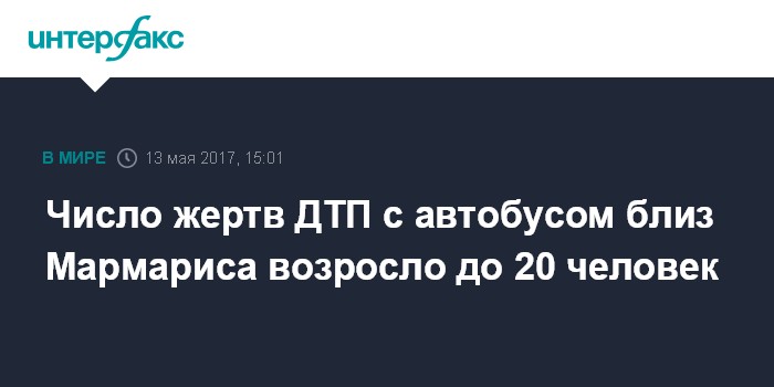 Москва. 13 мая. INTERFAX.RU - Не менее 20 человек стали жертвами ДТП с участием туристического автобуса, которое произошло на юго-западе Турции в районе города Мармарис, сообщают в субботу западные СМИ со ссылкой на губернатора провинции Мугла Амира Чичека.