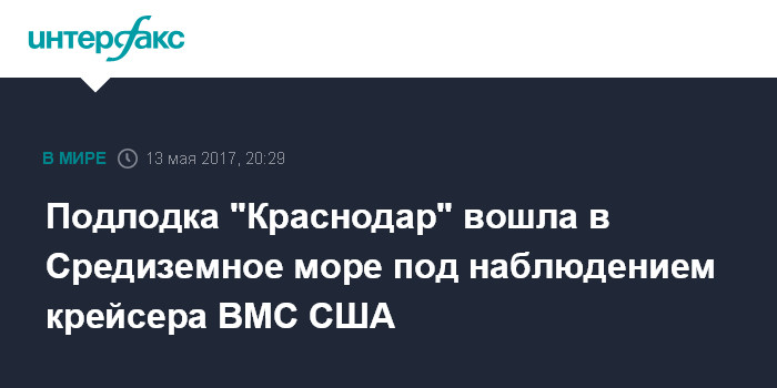 Москва. 13 мая. INTERFAX.RU - Новейшая ракетная подводная лодка ВМФ России "Краснодар", осуществляющая переход из Балтики на постоянное место базирования в Черное море, в субботу, пройдя Гибралтарский пролив, вошла в акваторию Средиземноморья.