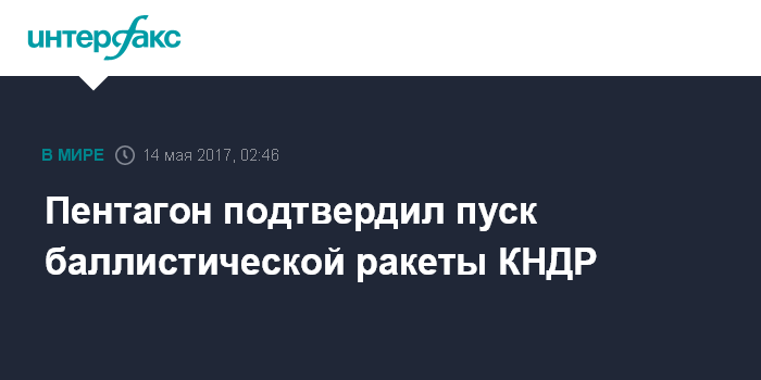 Москва. 14 мая. INTERFAX.RU - Северная Корея в воскресенье осуществила испытательный пуск неизвестного пока типа баллистической ракеты среднего радиуса действия, сообщил телеканал Fox News, ссылаясь на представителя Пентагона.