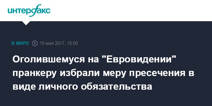Москва. 15 мая. INTERFAX.RU - Днепровский районный суд Киева избрал пранкеру Виталию Седюку за инцидент в финале Евровидения-2017 меру пресечения в виде личного обязательства на срок 60 суток.