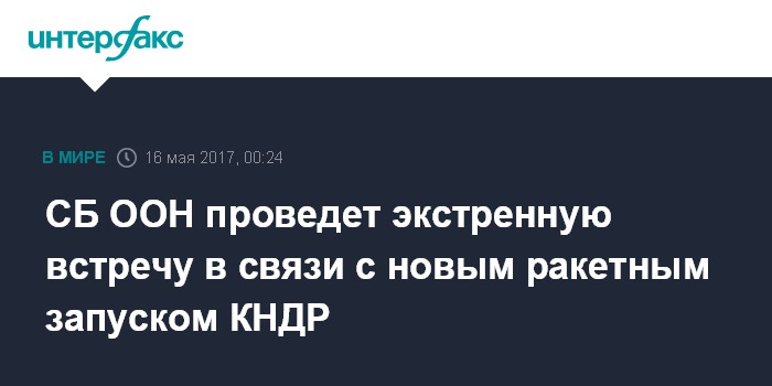 Москва. 16 мая. INTERFAX.RU - Совет Безопасности ООН во вторник соберется на экстренную консультацию по поводу нового ракетного испытания, проведенного в КНДР 14 мая. Заседание пройдет по инициативе США, Японии и Южной Кореи. В постпредстве Уругвая, который председательствует в мае в СБ ООН, подтвердили факт проведения этого заседания, отметив, что оно должно пройти в закрытом режиме.