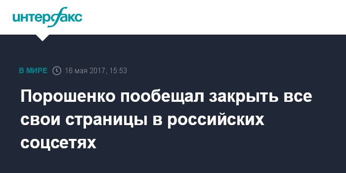 "Украинские интернет-провайдеры должны прекратить предоставлять доступ к "ВКонтакте", "Одноклассники", "Яндекс" и другим российским сервисам. Все официальные страницы президента в этих сервисах будут закрыты. Призываю всех соотечественников немедленно выйти из российских серверов из соображений безопасности", - говорится в заявлении, обнародованном на странице Порошенко в соцсети "ВКонтакте" во вторник днем.