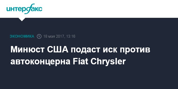 Москва. 18 мая. INTERFAX.RU - Акции Fiat Chrysler Automobiles (FCA) на торгах в Милане в четверг теряют в цене более 5% на информации о том, что министерство юстиции США готовится подать судебный иск против автопроизводителя.