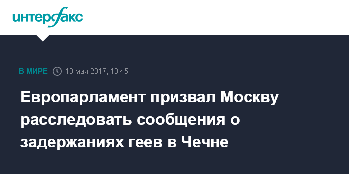 Москва. 18 мая. INTERFAX.RU - Европарламент призвал Москву провести беспристрастное расследование сообщений о произвольных задержаниях и пытках геев в Чечне.