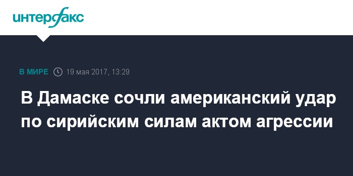 Москва. 19 мая. INTERFAX.RU - В Дамаске расценивают удар США по сирийским правительственным силам как акт агрессии, заявил постпред Сирии при ООН, глава правительственной делегации на женевских переговорах Башар Джаафари.