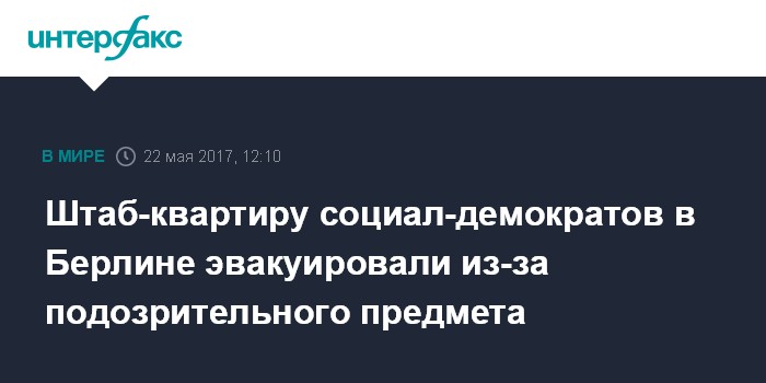 Москва. 22 мая. INTERFAX.RU - Штаб-квартира Социал-демократической партии Германии (СДПГ) была эвакуирована в понедельник в Берлине в связи с обнаружением подозрительного предмета, сообщает немецкая газета Das Bild.