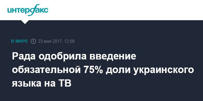 Москва. 23 мая. INTERFAX.RU - Верховная рада Украины приняла во втором чтении и в целом законопроект, который устанавливает обязательную долю украиноязычного контента на телевидении в объеме 75% от общего объема.