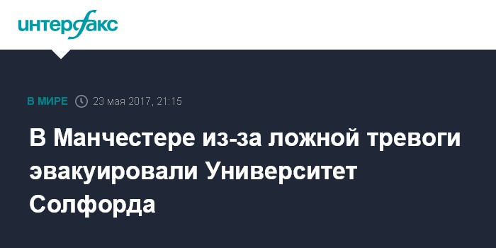 Москва. 23 мая. INTERFAX.RU - Полиция эвакуировала студентов из кампуса, библиотеки и еще двух зданий в студенческом городке Солфордского университета в Манчестере, говорится в сообщении учебного заведения в твиттере.