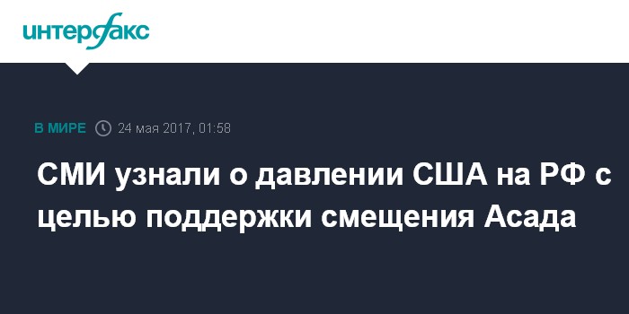 Москва. 24 мая. INTERFAX.RU - Позиция США по поводу политической судьбы президента Сирии Башара Асада остается неизменной, несмотря на все предвыборные заявления американского президента Дональда Трампа, допускавшего сотрудничество с сирийским лидером в борьбе с ИГИЛ (деятельность организации запрещена в РФ): администрация США будет добиваться его ухода, сообщает в среду газета "Известия" со ссылкой на свои источники в дипломатических кругах.
