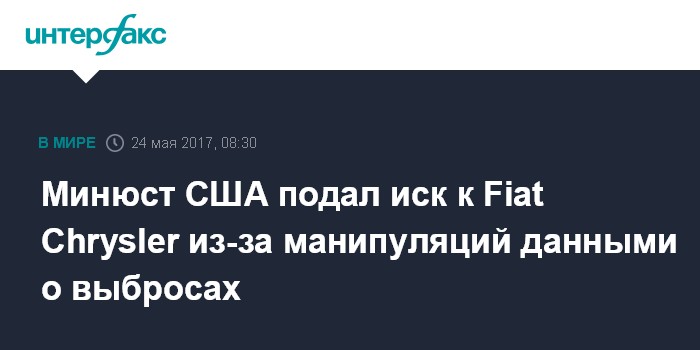 Москва. 24 мая. INTERFAX.RU - Министерство юстиции США во вторник подало судебный иск против Fiat Chrysler Automobiles (FCA), обвинив компанию в использовании программного обеспечения для занижения показателей выбросов в порядка 104 тысячах автомобилей с дизельными двигателями.