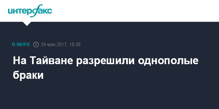 Москва. 24 мая. INTERFAX.RU - Конституционный суд Тайваня разрешил однополым парам вступать в брак, передает в среду "Би-би-си".