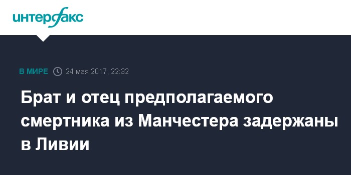 Москва. 24 мая. INTERFAX.RU - Стражи порядка задержали в Ливии брата и отца предполагаемого исполнителя теракта в Манчестере Салмана Абеди, сообщили западные СМИ со ссылкой на правоохранительные органы Ливии.