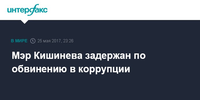 Москва. 25 мая. INTERFAX.RU - Мэр Кишинева Дорин Киртоакэ задержан в четверг по обвинению в коррупционных преступлениях. Как передает корреспондент "Интерфакса" с места событий, вечером его вывели из кабинета сотрудники Национального Центра по борьбе с коррупцией.