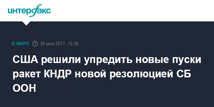 Москва. 26 мая. INTERFAX.RU - США, КНР и ряд других стран обсуждают новую резолюцию СБ ООН по КНДР с тем, чтобы сократить время на принятие мер в ответ на возможные новые ракетные пуски или ядерные испытания Пхеньяна. Об этом сообщила и.о.помощника госсекретаря США Сьюзан Торнтон.