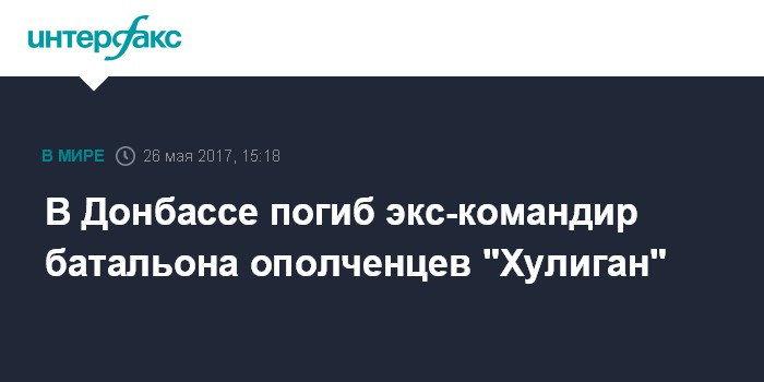 Москва. 26 мая. INTERFAX.RU - Бывший командир батальона ополченцев "Хулиган" Владимир Цвях получил смертельное ранение в бою с украинскими военными, сообщили "Интерфаксу" в Совете министров самопровозглашенной Луганской народной республики.